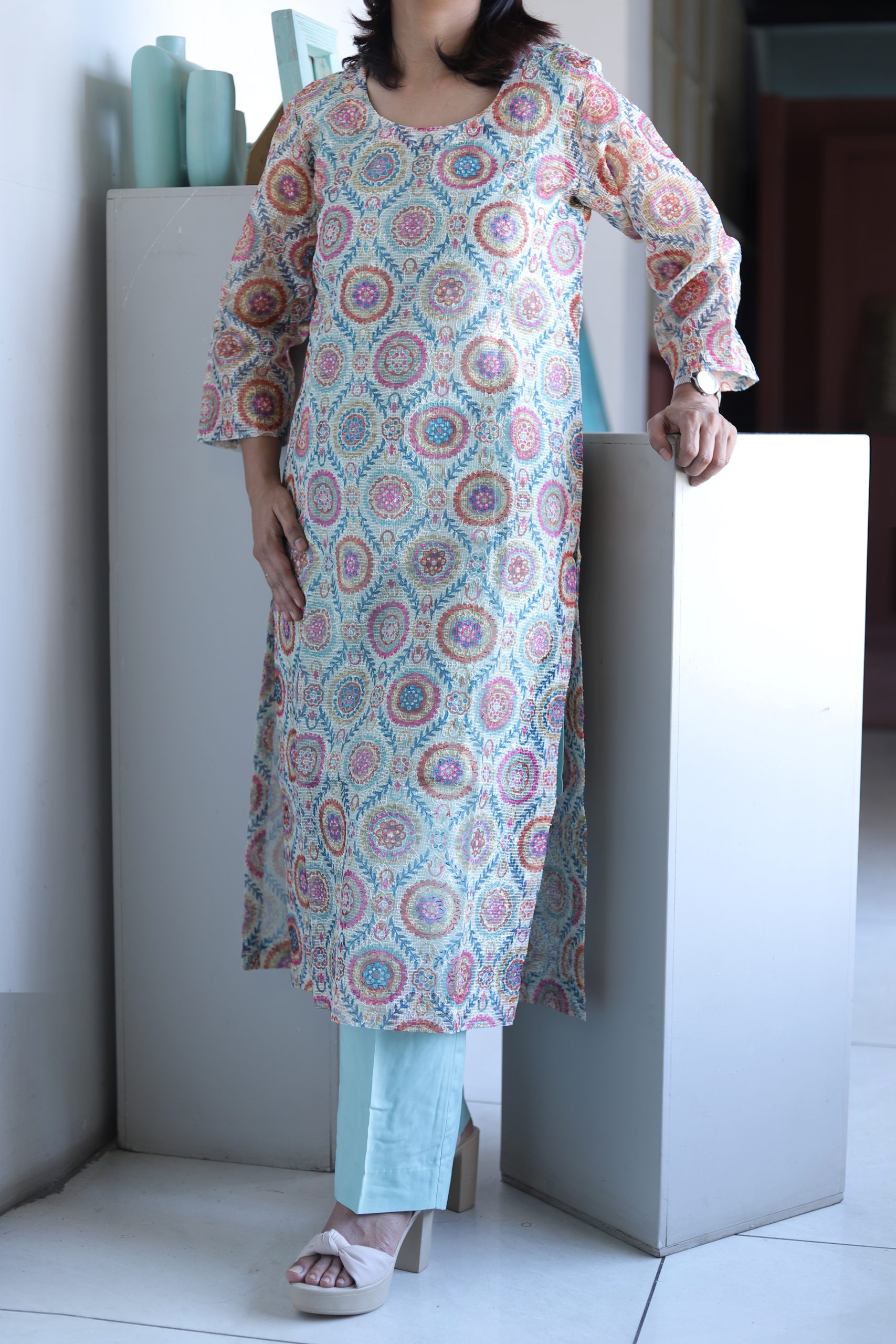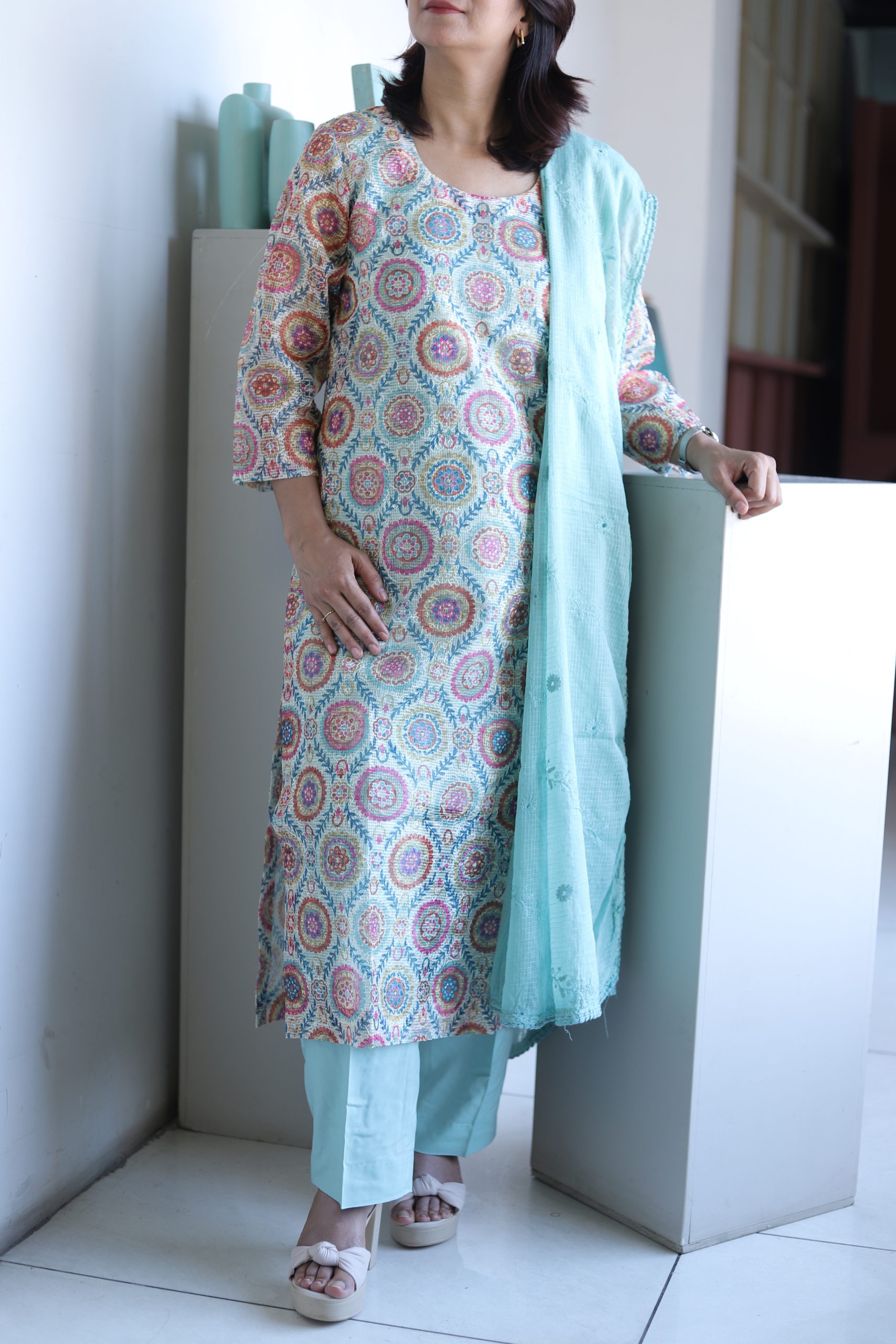 The kurta’s subtle woven texture and straight silhouette create a graceful flow, while the matching cotton bottoms add comfort and ease. A finely detailed Kota Doria dupatta completes the look, making it a versatile outfit for festive gatherings or everyday chic.
