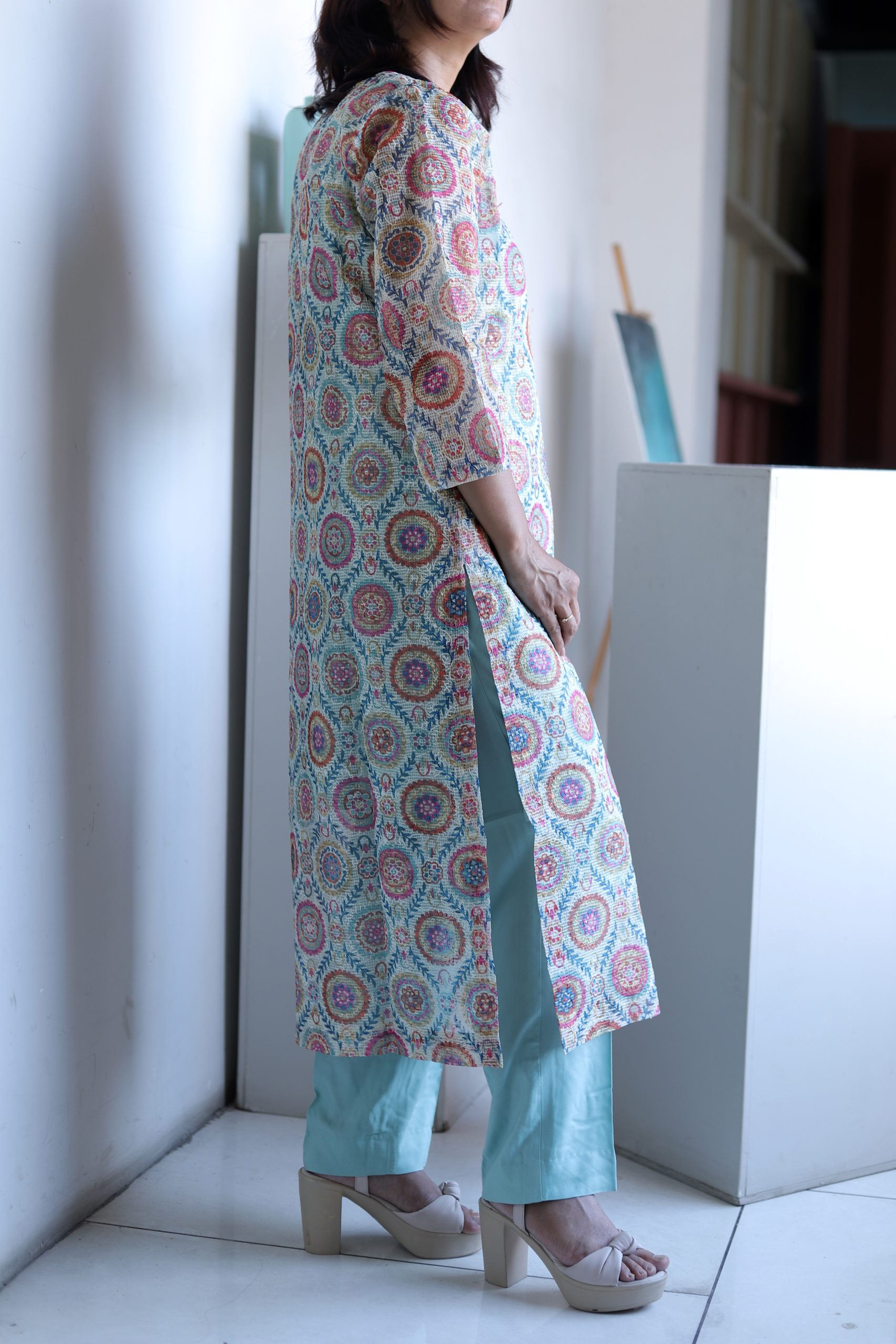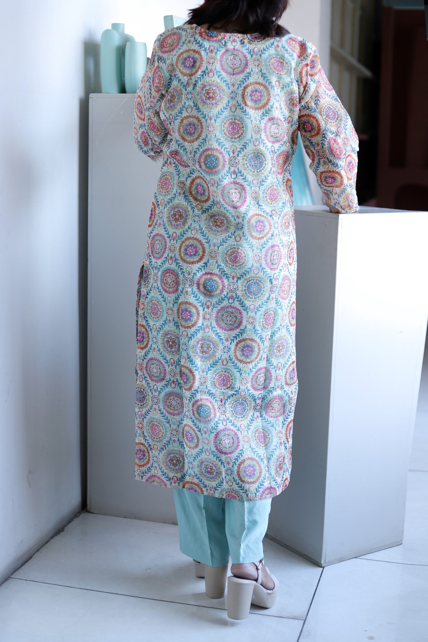 Refresh your ethnic wardrobe with the timeless charm of our Aqua Mist Kota Doria Kurta Set, a delicate ensemble that embodies sheer elegance. Crafted from airy Kota Doria fabric, this kurta in a soothing aqua mist hue brings together lightness and sophistication, making it perfect for all-day wear.