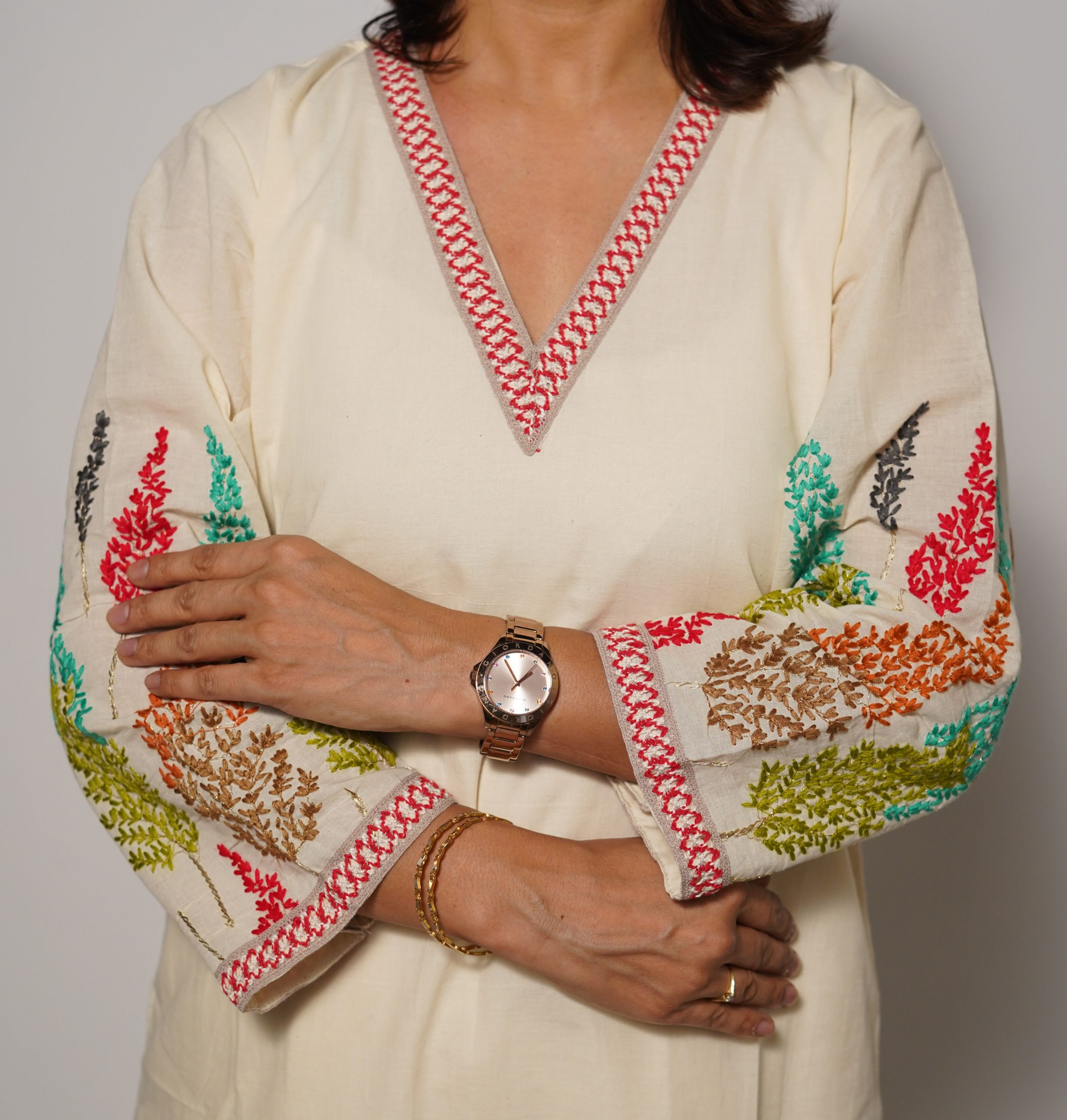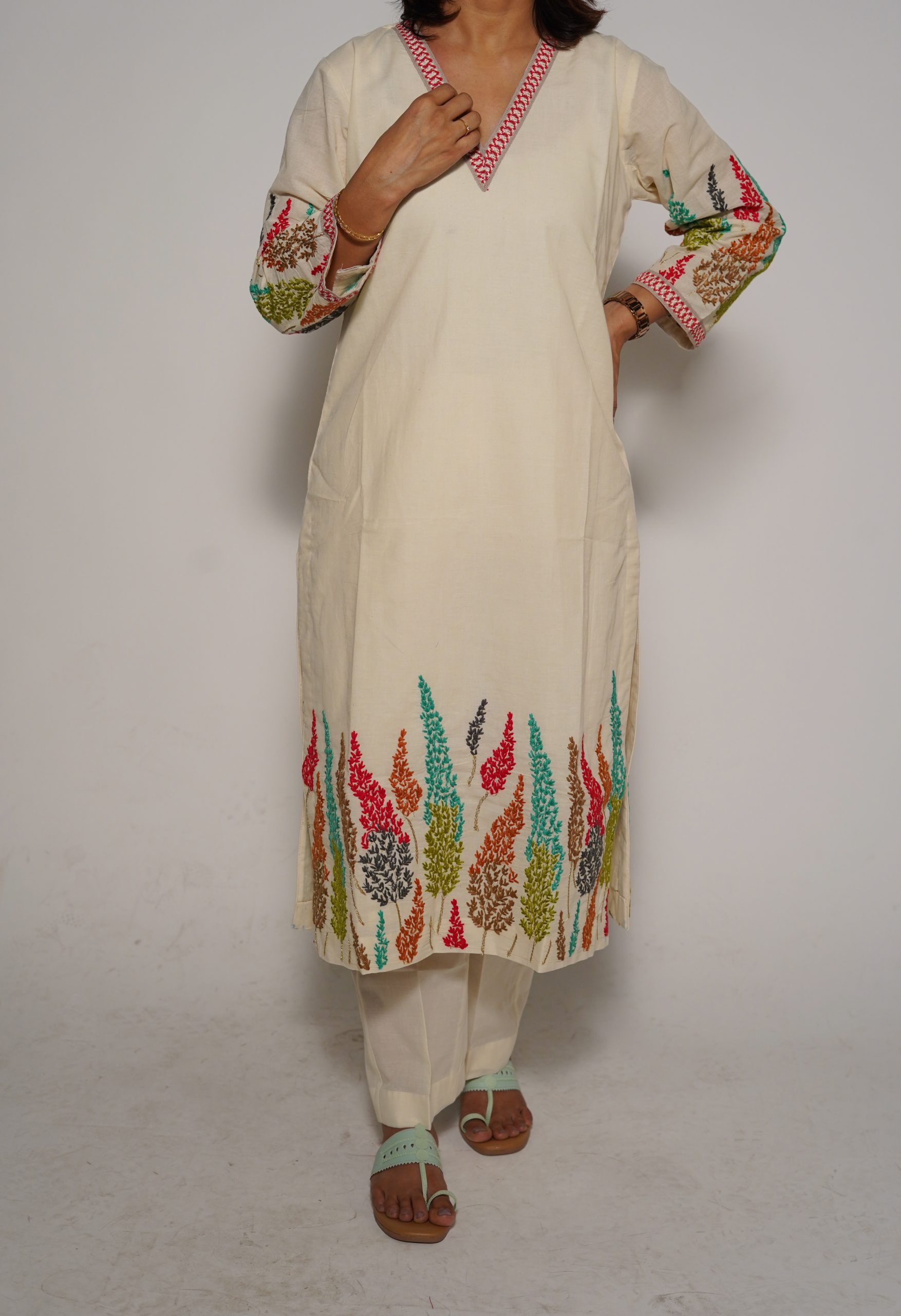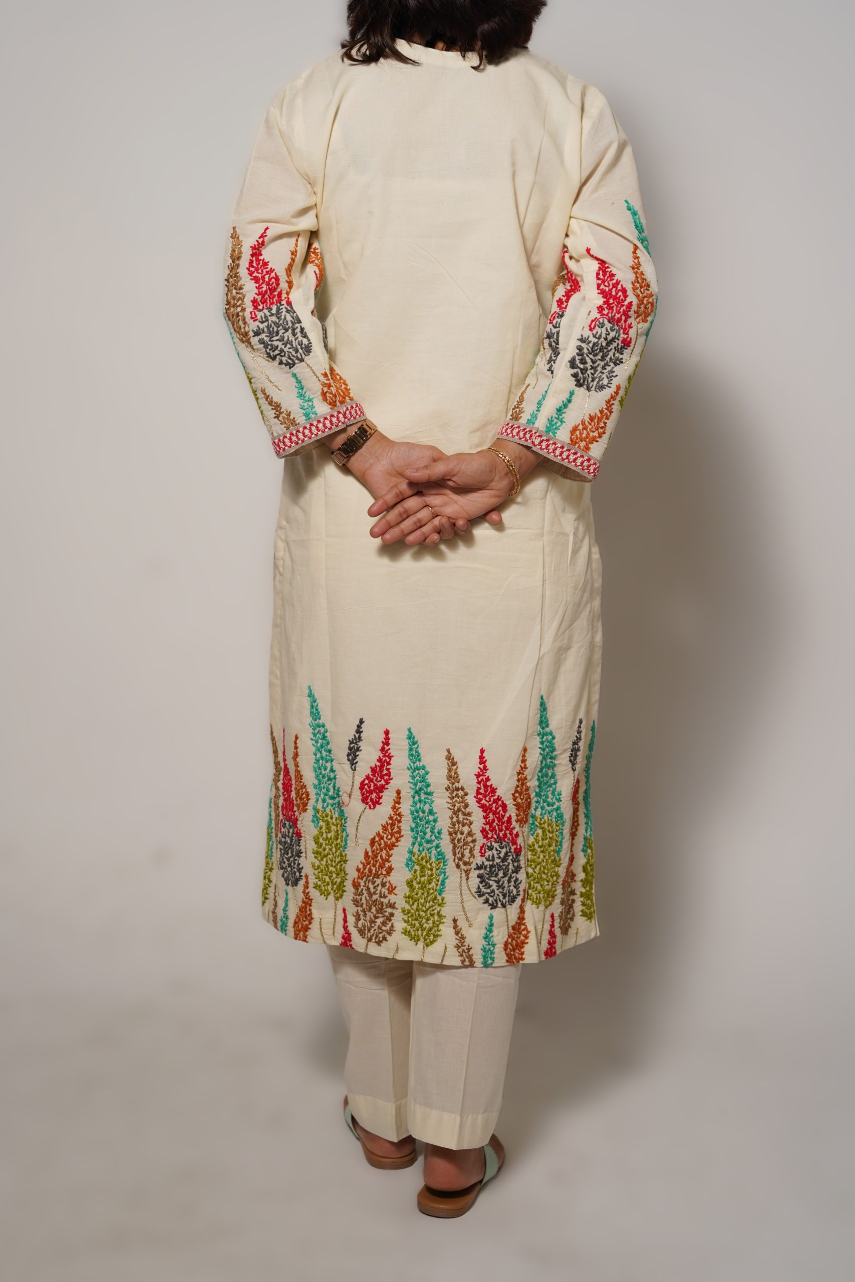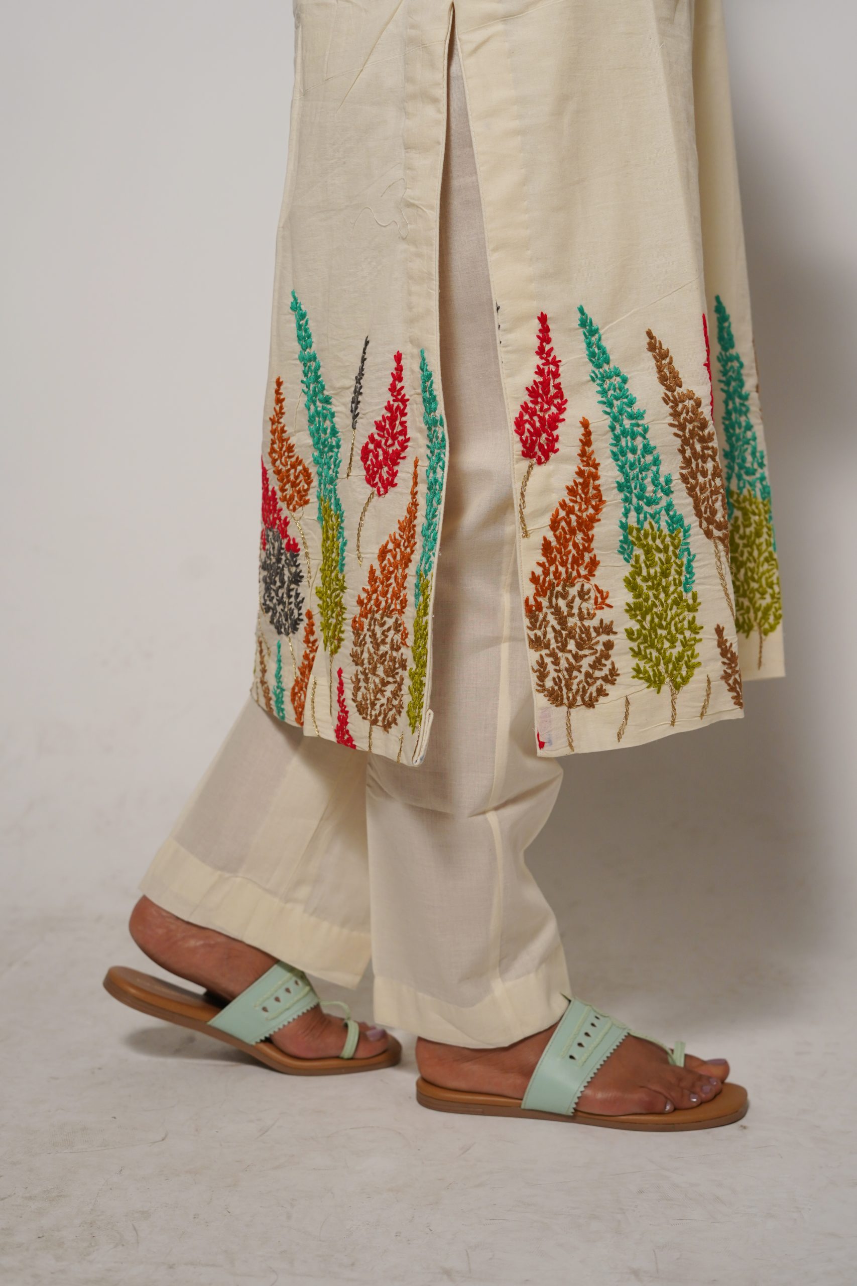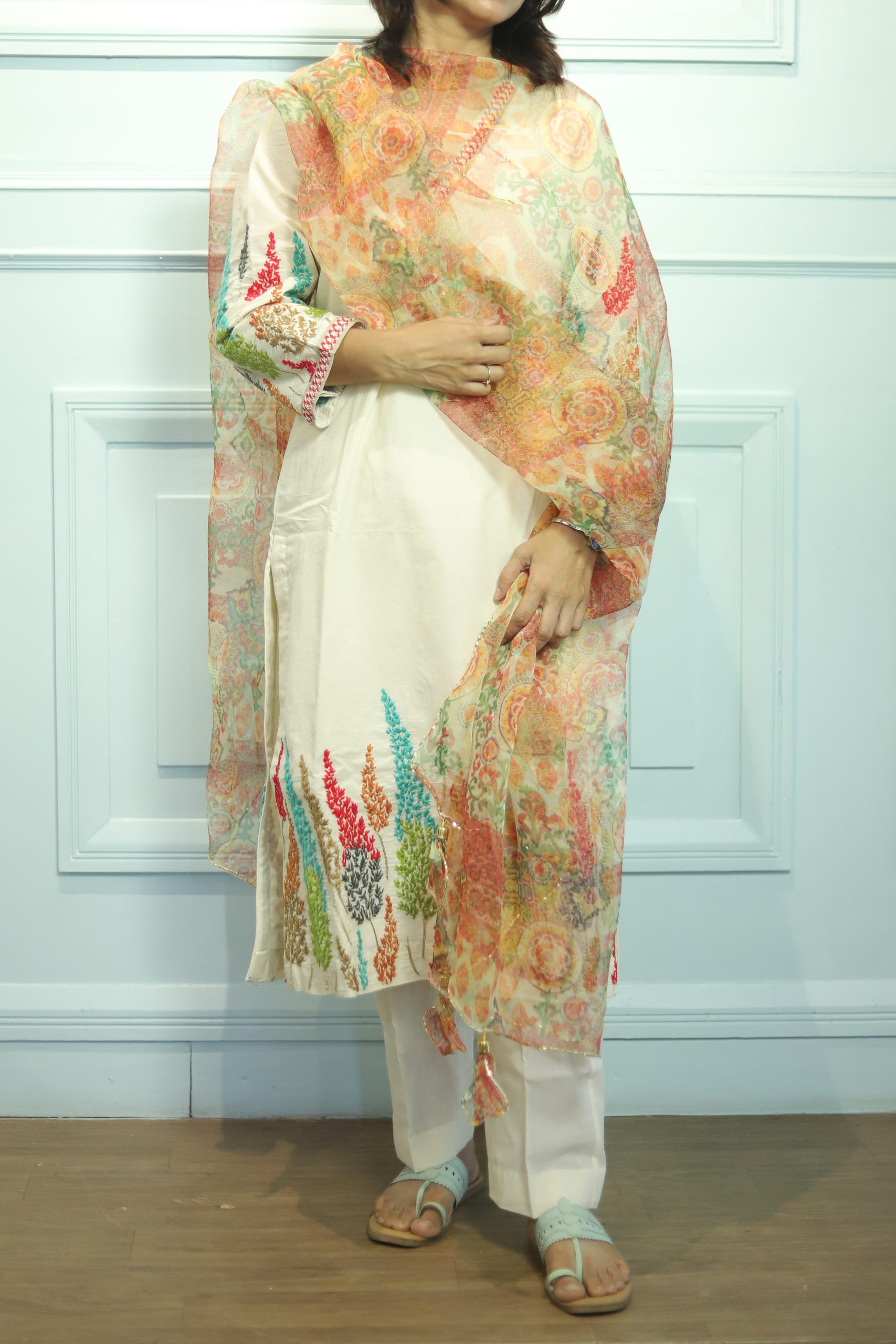 Celebrate the joy of spring with our Happy Spring Kurta Set, crafted from soft breathable pure cotton in a crisp off white shade. This set blooms with vibrant, colourful embroidery that adds a cheerful pop of life to your wardrobe, perfectly paired with a delicate, sheer organza dupatta for an airy, elegant finish. Lightweight and comfortable, it’s designed to keep you cool and stylish through sunny days, family gatherings, or festive celebrations.