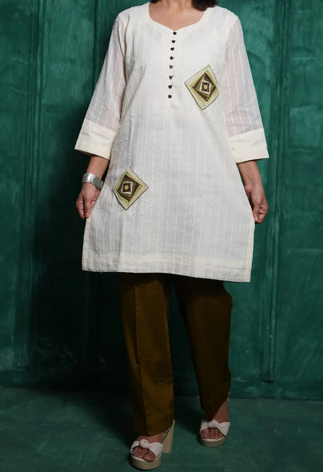 Elevate your everyday look with this elegant Off-White Crochet Work Kurta. Featuring delicate patchy embroidery on soft, breathable fabric, it brings a refined texture that’s perfect for casual days or office chic.